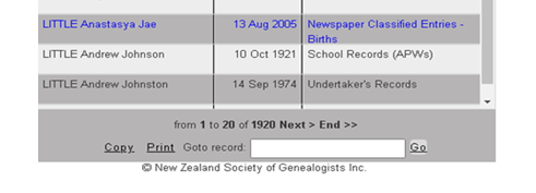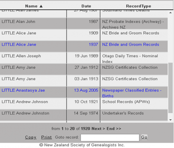 This NZSG Kiwi Collection contains in excess of 11 million individual records. For this reason, search results may take time to be delivered. Most of the records that have never been published in earlier version of the NZSG Kiwi Collection are displayed in Blue font.